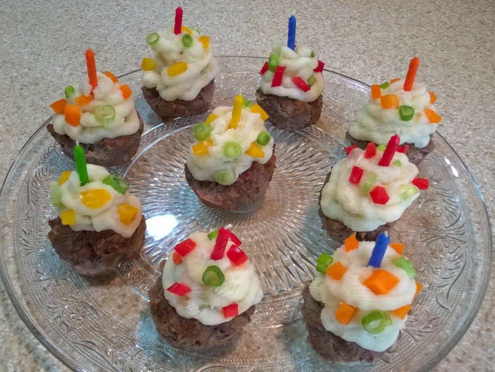 Sprinkle/push in diced colorful bell peppers and thinly sliced scallions into the mashed potato frosting (in lieu of chocolate sprinkles).